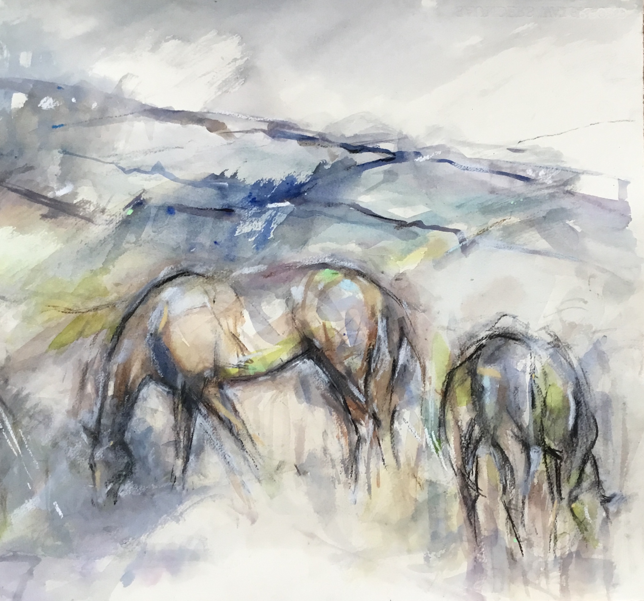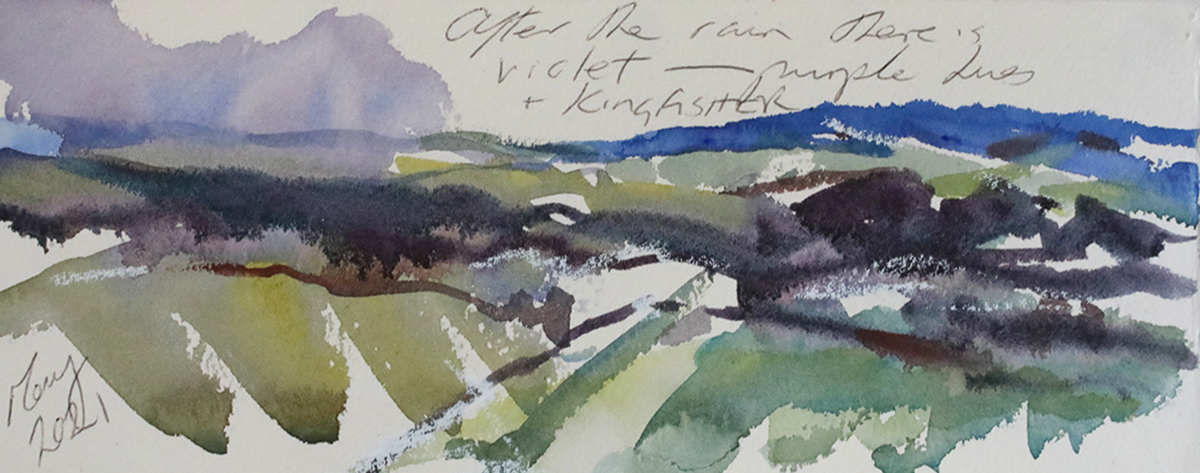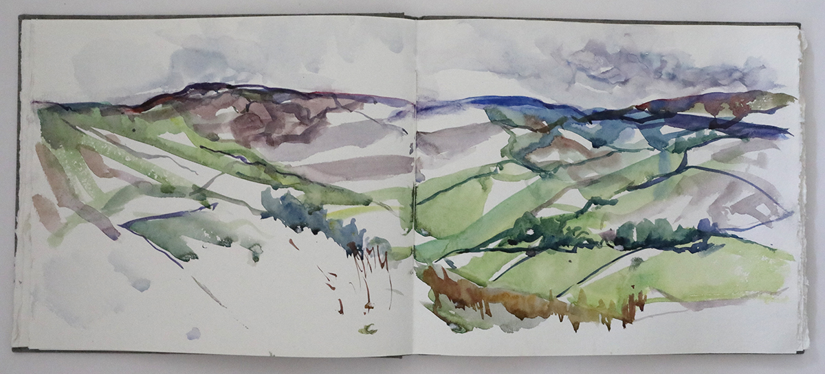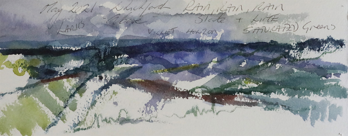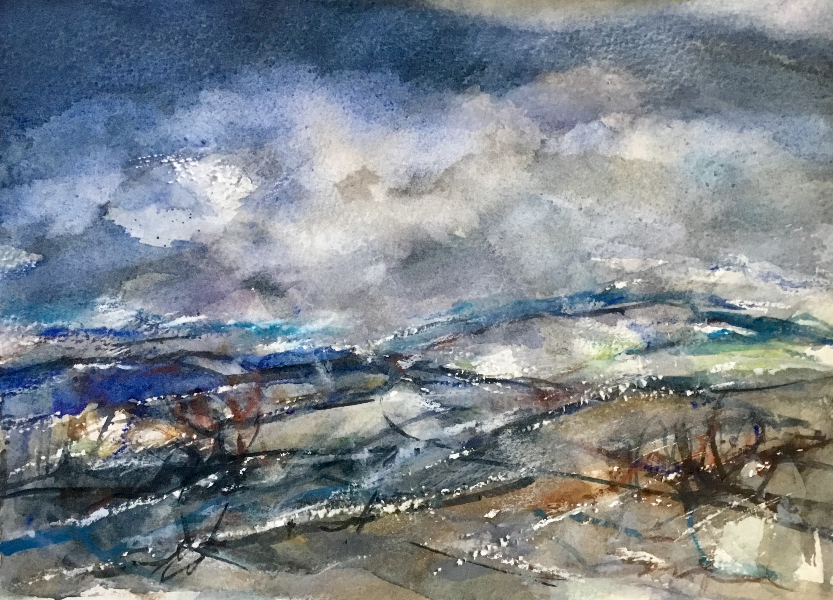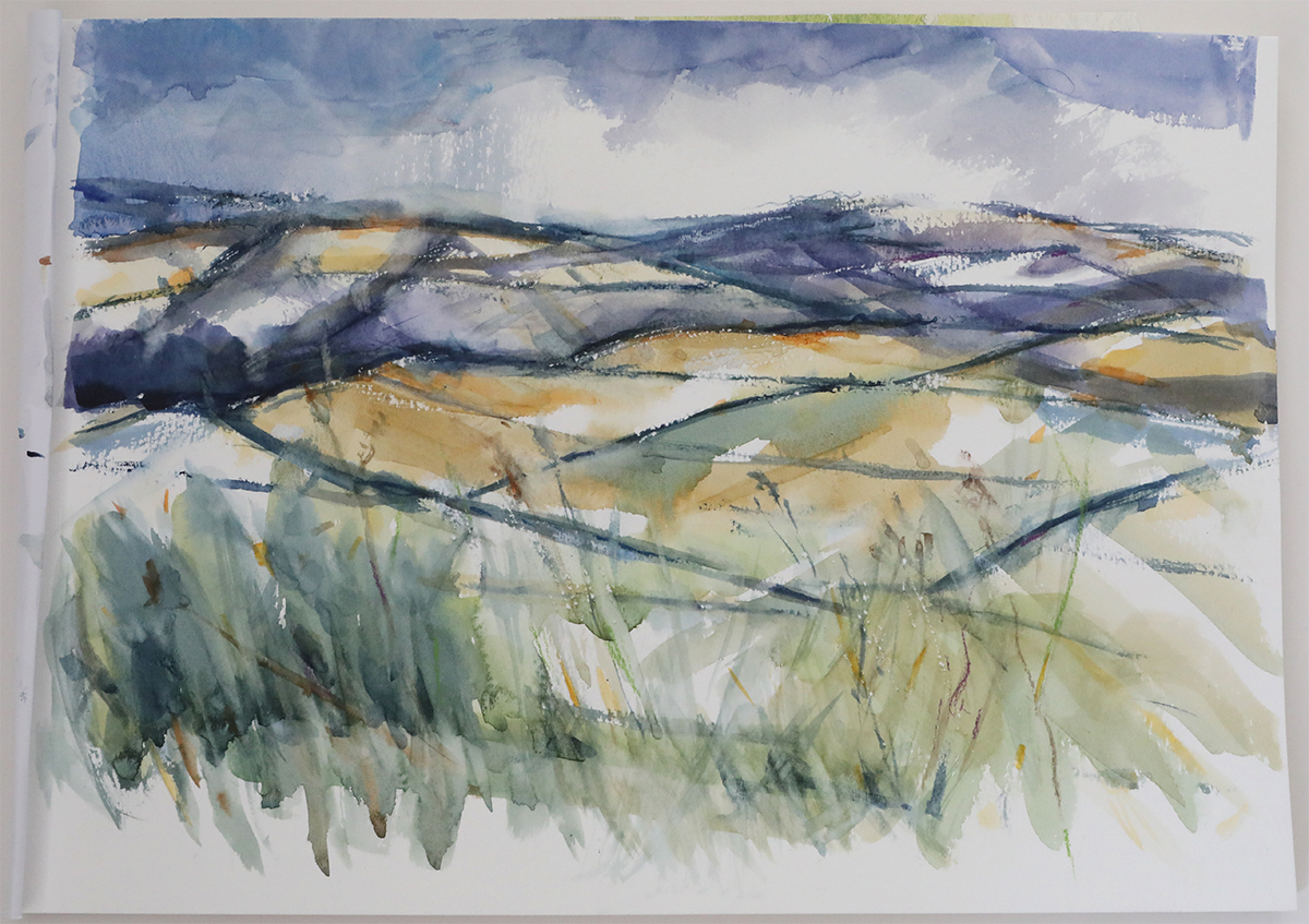 The Cotswolds Hills that surround her home are now her main source of inspiration, although she enjoys painting other parts of the country. Galloway, Kent, Somerset and Yorkshire all feature in recent work.
