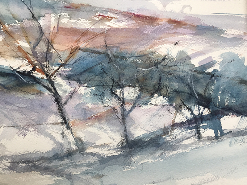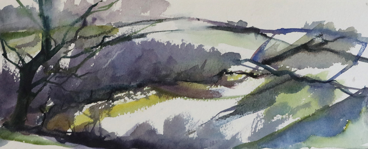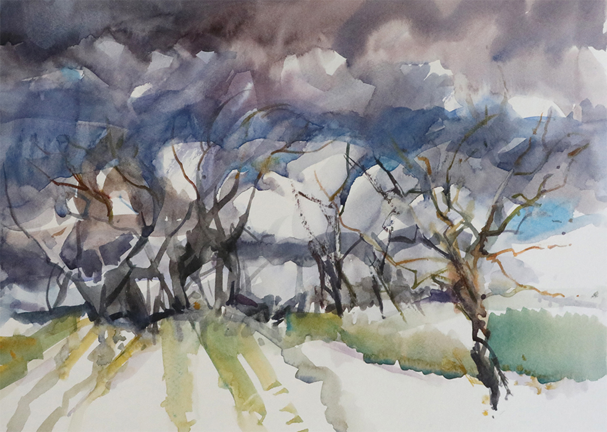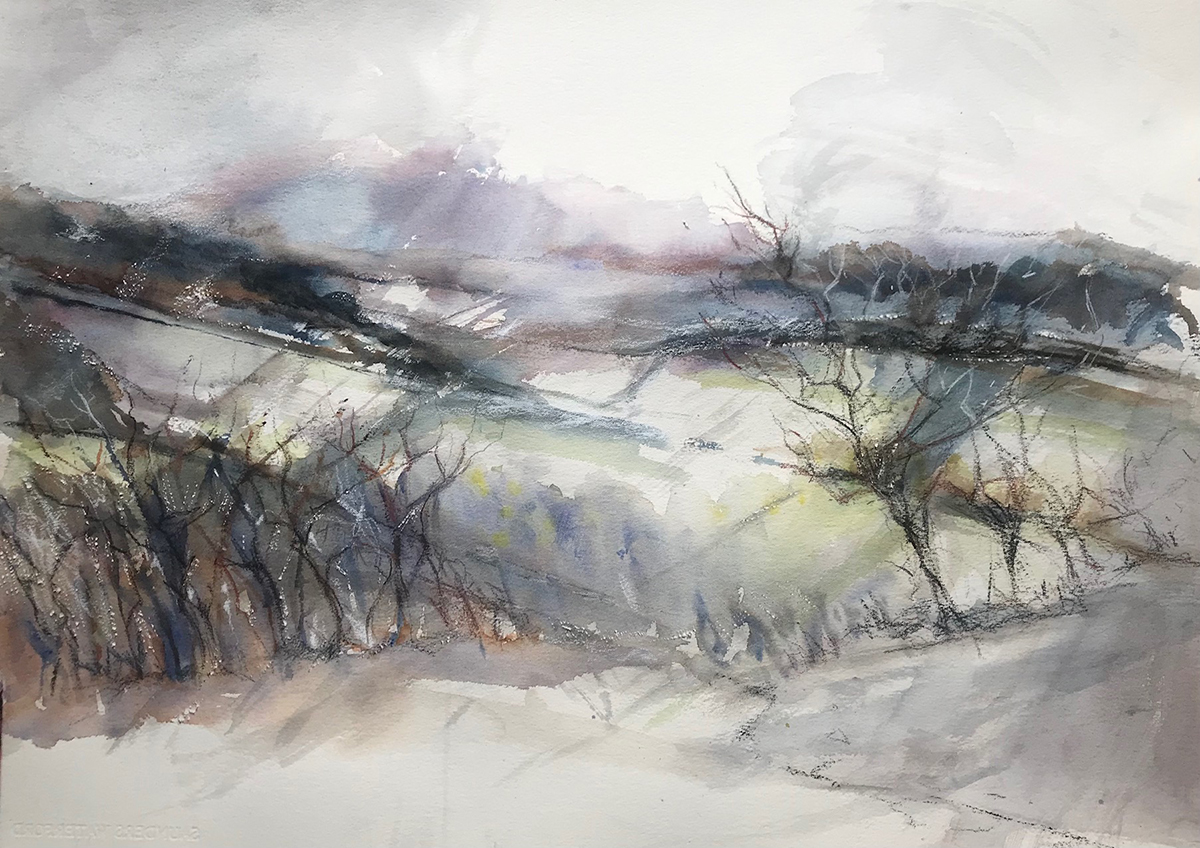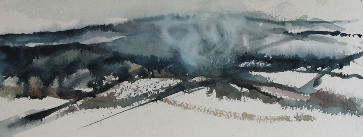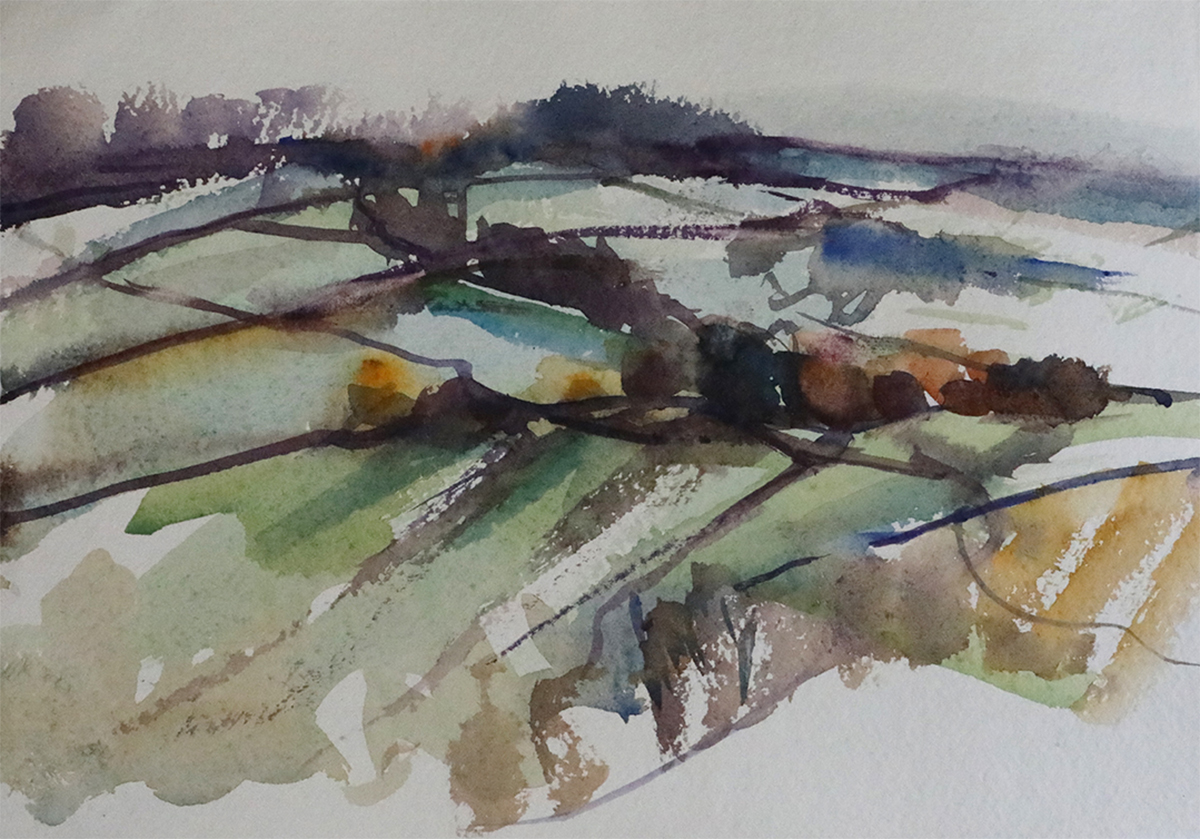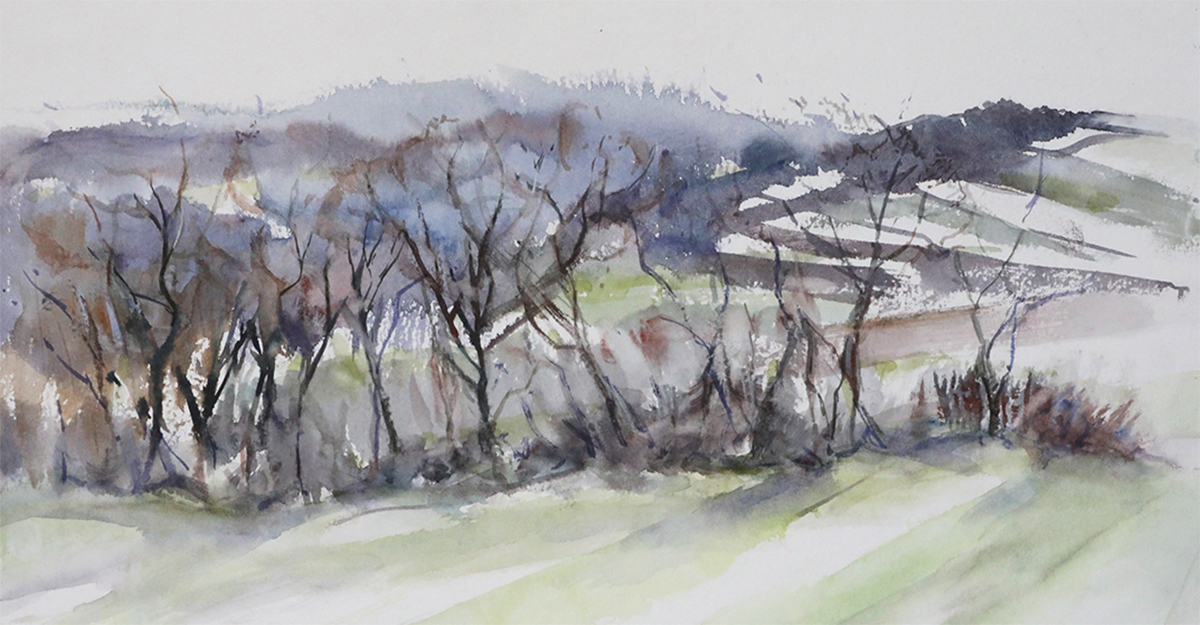 Her landscapes, painted in watercolour, have an abstract quality and are characterised by their loose fluidity in capturing the quality of light. The seasons and their impact on landscape bring continual interest to Melanie, and she finds the bare bones of winter landscapes particularly inspiring.