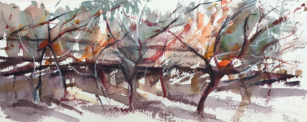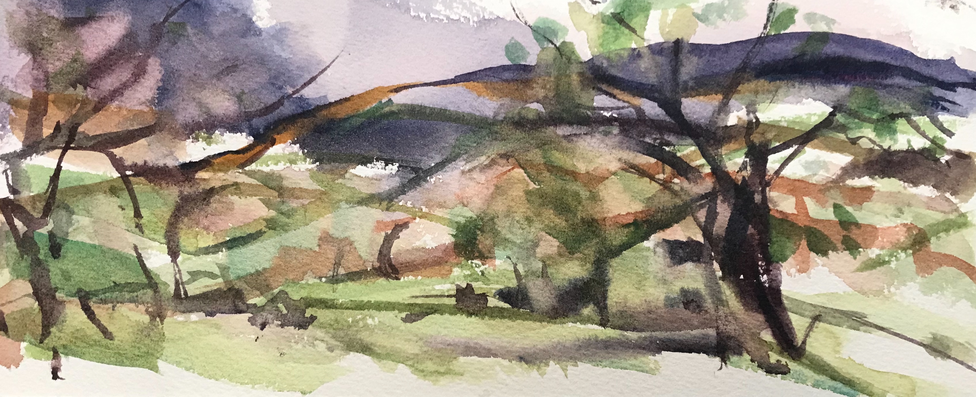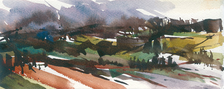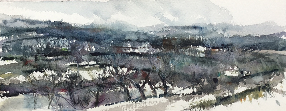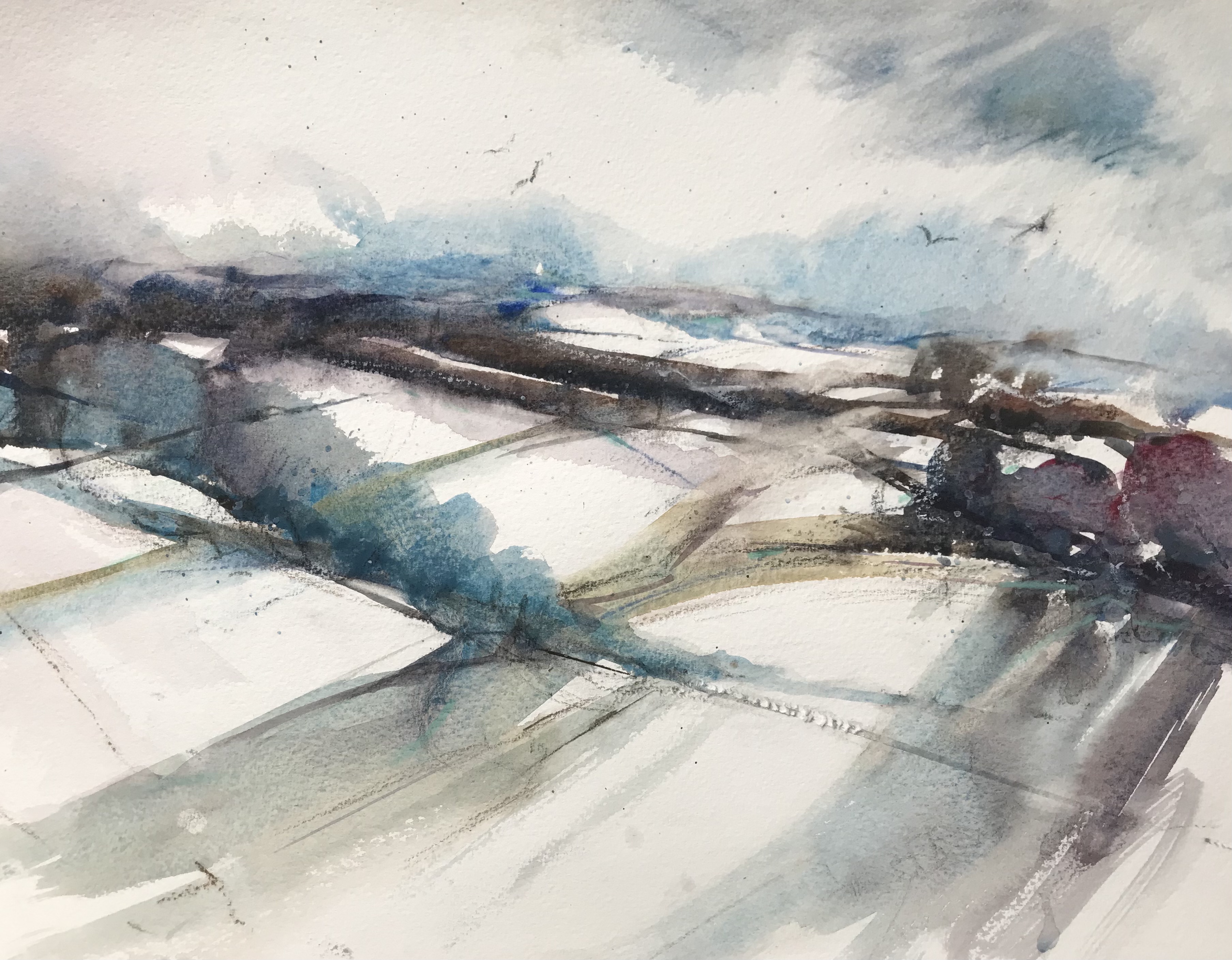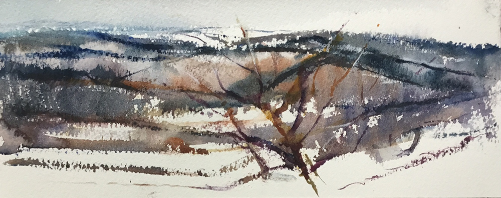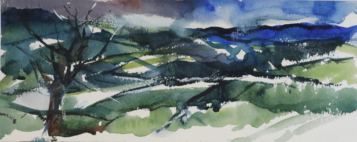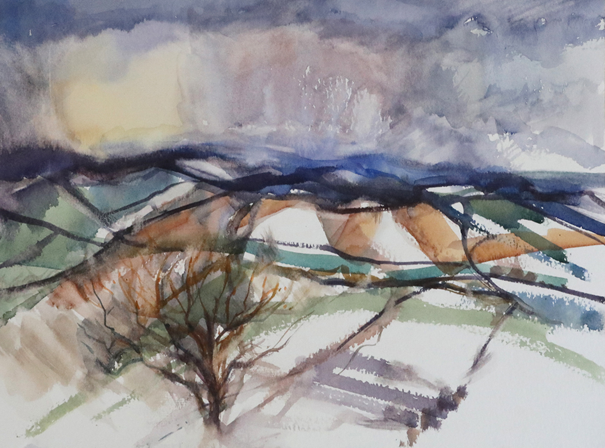 Her landscapes, painted in watercolour, have an abstract quality and are characterised by their loose fluidity in capturing the quality of light. The seasons and their impact on landscape bring continual interest to Melanie, and she finds the bare bones of winter landscapes particularly inspiring.