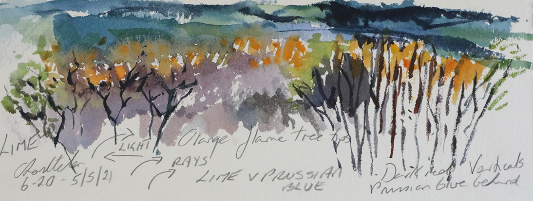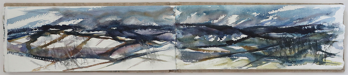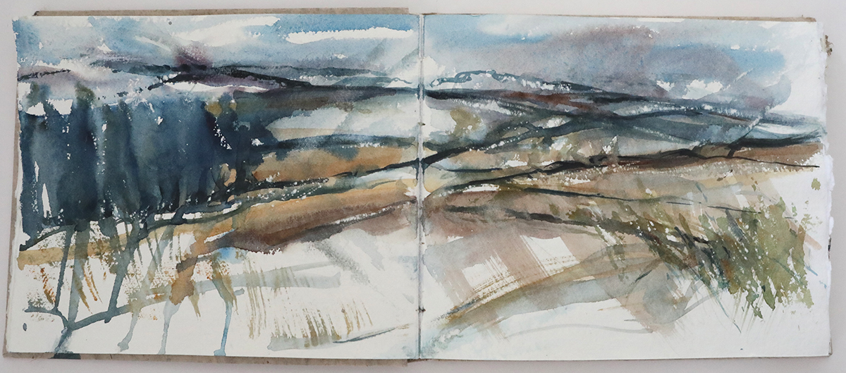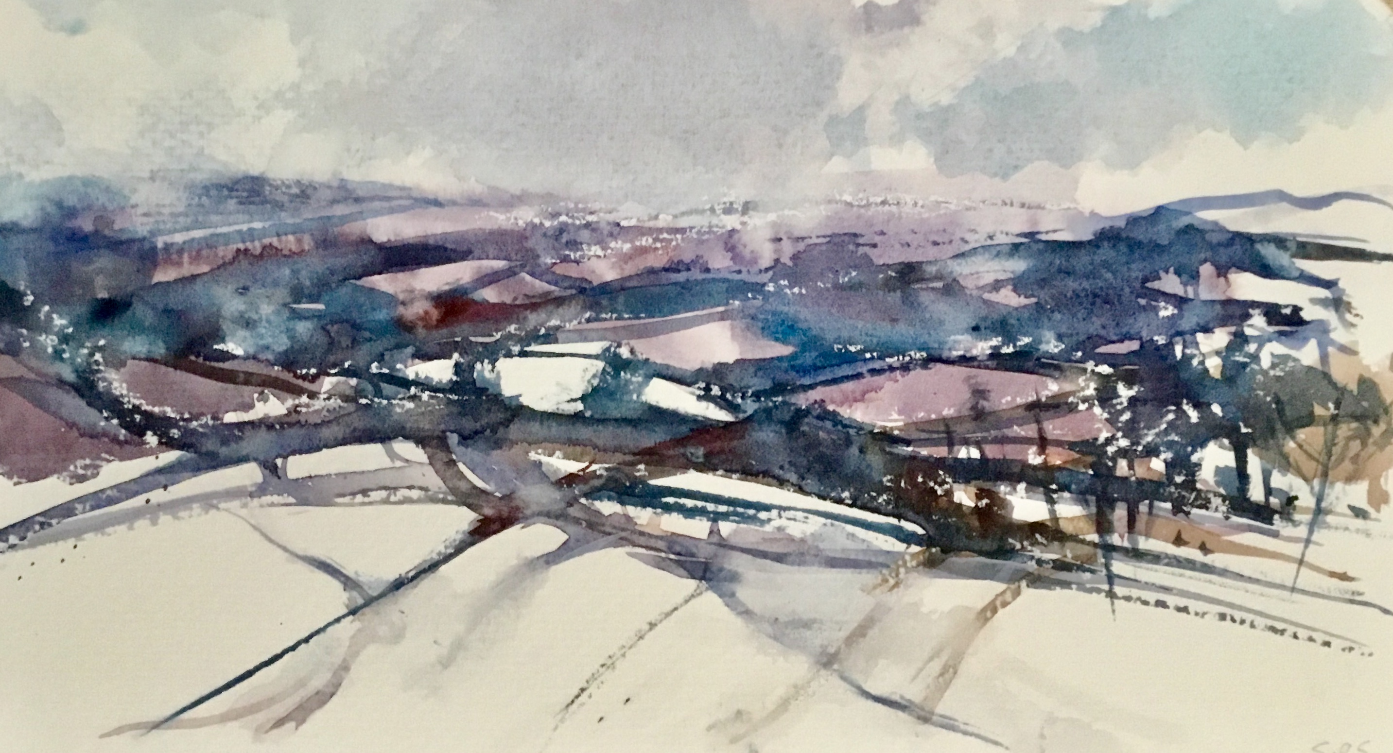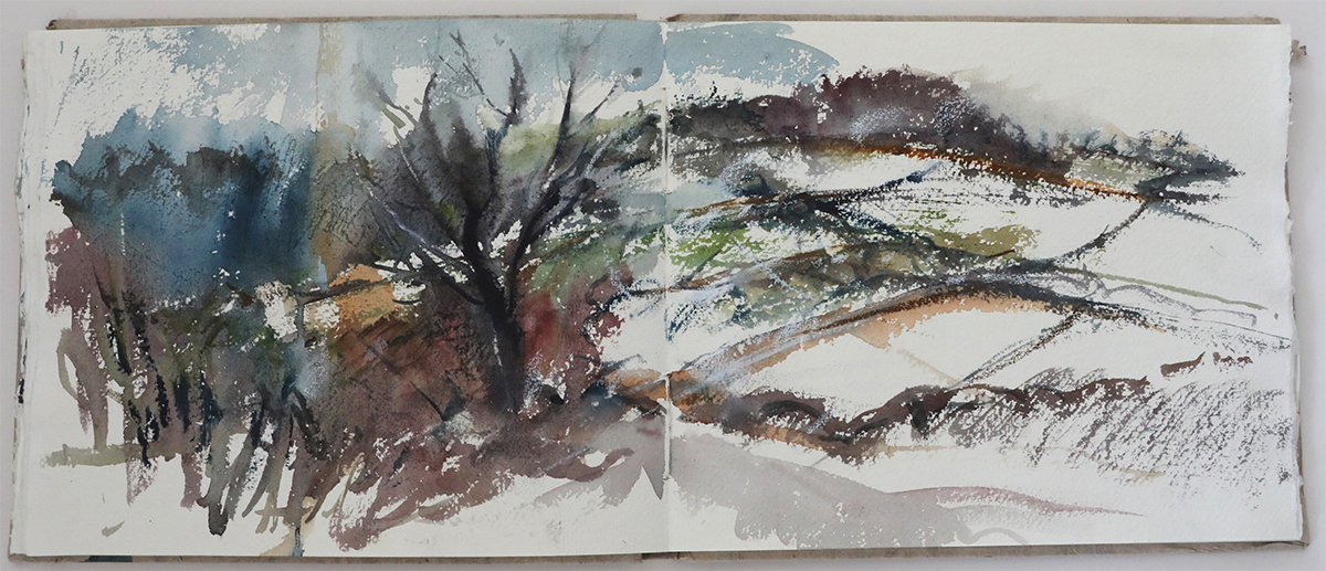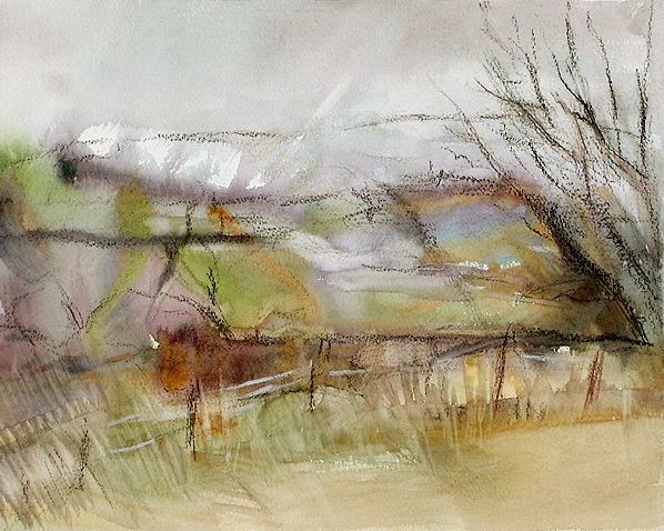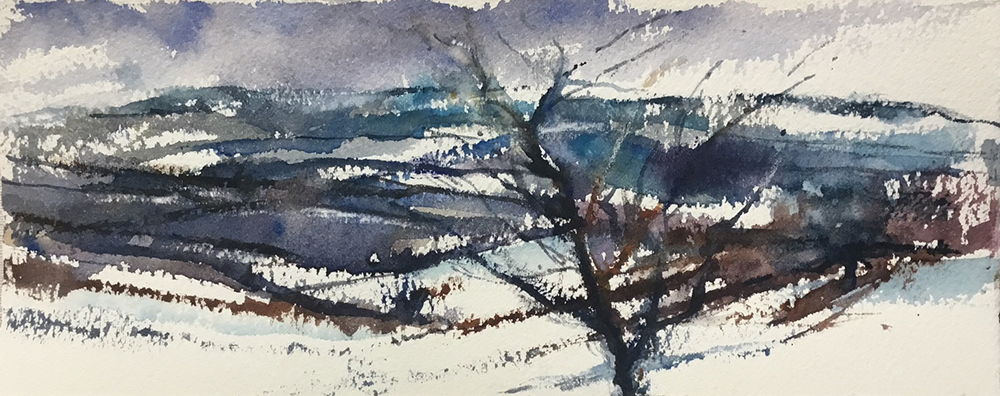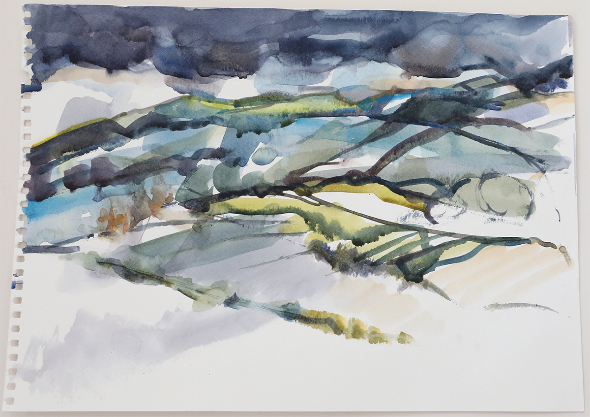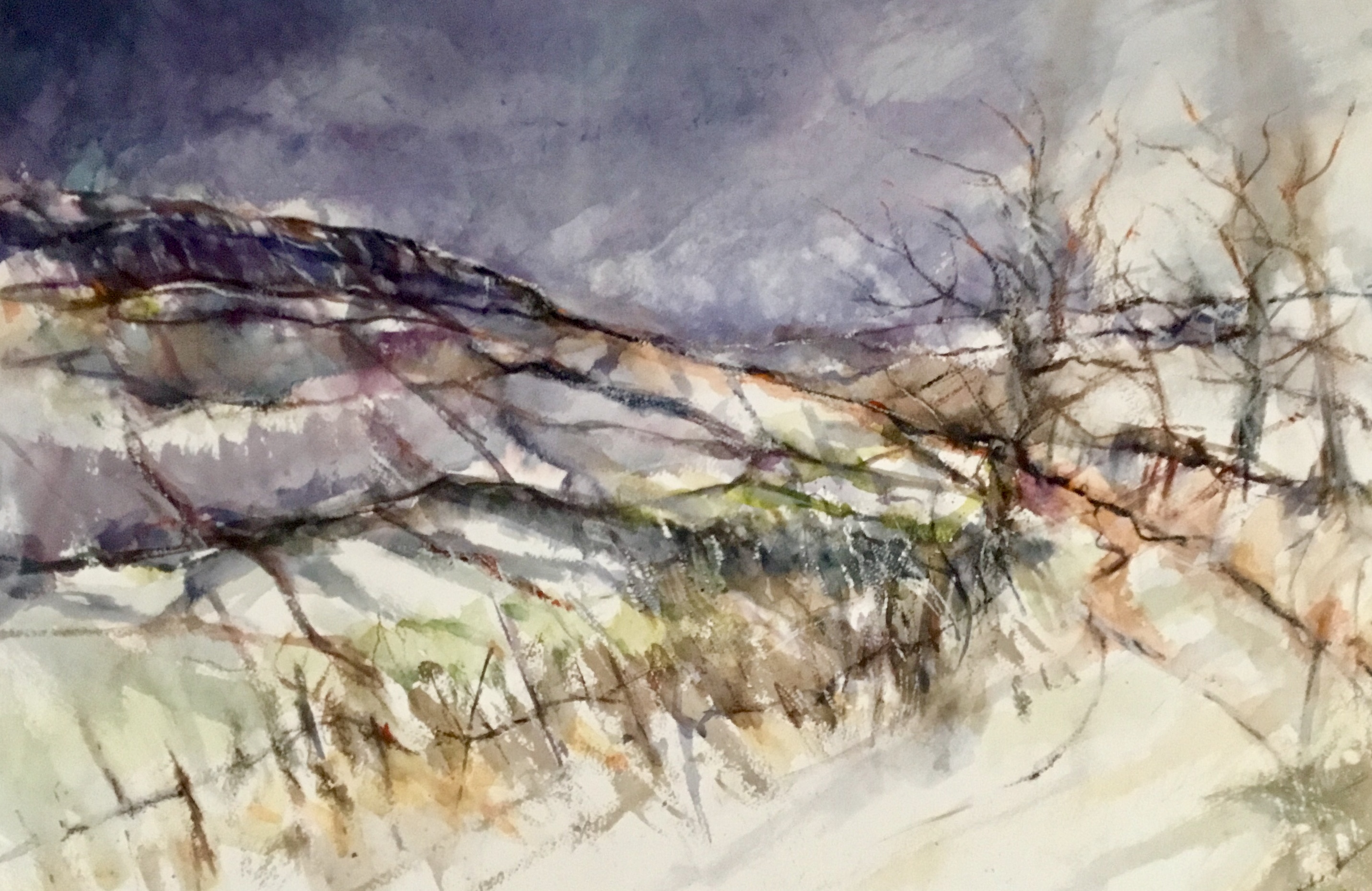 Her landscapes, painted in watercolour, have an abstract quality and are characterised by their loose fluidity in capturing the quality of light. The seasons and their impact on landscape bring continual interest to Melanie, and she finds the bare bones of winter landscapes particularly inspiring.